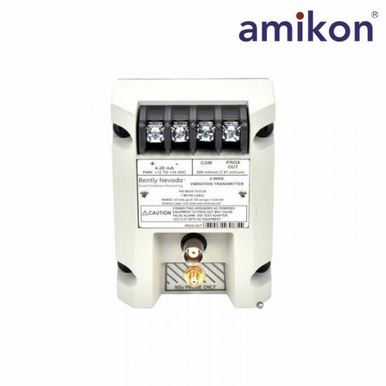 เครื่องส่งสัญญาณการสั่นสะเทือนรุ่น 990 ออกแบบมาเพื่อผู้ผลิตอุปกรณ์ดั้งเดิม (OEM) ของเครื่องอัดอากาศแบบแรงเหวี่ยง หรือปั๊มขนาดเล็ก มอเตอร์ หรือพัดลม ที่ต้องการส่งสัญญาณการสั่นสะเทือนแบบสัดส่วน 4 ถึง 20 mA เป็นอินพุตให้กับระบบควบคุมเครื่องจักร เครื่องส่งสัญญาณนี้เป็นอุปกรณ์แบบสองสาย ใช้พลังงานจากลูป และรับสัญญาณอินพุตจากโพรบตรวจจับระยะใกล้รุ่น 3300 NSv และสายต่อขยายที่เข้ากัน (มีให้เลือกความยาว 5 เมตร และ 7 เมตร) เครื่องส่งสัญญาณจะปรับสภาพสัญญาณให้เป็นหน่วยทางวิศวกรรมของแอมพลิจูดการสั่นสะเทือนแบบพีคต่อพีคที่เหมาะสม และส่งค่านี้เป็นสัญญาณมาตรฐานอุตสาหกรรมแบบสัดส่วน 4 ถึง 20 mA เป็นอินพุตให้กับระบบควบคุม ซึ่งจะเกิดการแจ้งเตือนและการทำงานของตรรกะในการป้องกันเครื่องจักร