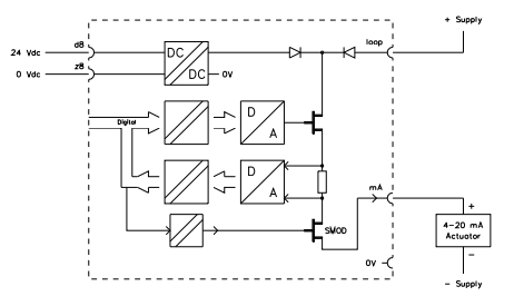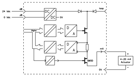โมดูลเอาต์พุตอะนาล็อกที่ปลอดภัย SAO-0220m มีช่องเอาต์พุต 0(4)—20 mA สองช่องสำหรับการใช้งานควบคุมอะนาล็อก โหลดต้องเป็นตัวต้านทานหรือตัวเก็บประจุเท่านั้น โหลดแบบเหนี่ยวนำจะทำให้โมดูลเอาต์พุตอะนาล็อกรายงานว่ามีข้อบกพร่อง เอาต์พุตอะนาล็อกทั้งสองแยกออกจากกันทางไฟฟ้าจาก 24 Vdc และ 5 Vdc ขา 0 V 1 (d14) และขา 0 V 2 (d20) เชื่อมต่อกันบนโมดูล แต่ละช่องเอาต์พุตอะนาล็อกประกอบด้วยตัวแปลง D/A 12 บิตสำหรับค่าเอาต์พุตและตัวแปลง A/D ซึ่งอ่านค่าเอาต์พุต การใช้ตัวแปลง A/D ทำให้สามารถตรวจสอบการทำงานที่ถูกต้องของช่องเอาต์พุตได้ ภายในช่วงเวลาการทดสอบการวินิจฉัยที่กำหนดค่าไว้ เอาต์พุตอะนาล็อกจะได้รับการทดสอบสำหรับ: