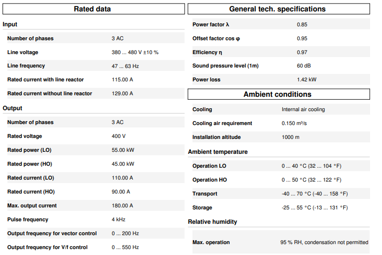 โมดูลจ่ายไฟ SINAMICS G120 PM240 แบบไม่กรอง พร้อมวงจรเบรกเกอร์ในตัว 380-480 V 3 AC +10/-10% 47-63 Hz กำลังไฟเกินพิกัดสูง: 45 kW ที่ 200% 3 วินาที, 150% 57 วินาที, 100% 240 วินาที อุณหภูมิแวดล้อม -10 ถึง +50 °C กำลังไฟเกินพิกัดต่ำ: 55 kW ที่ 150% 3 วินาที, 110% 57 วินาที, 100% 240 วินาที อุณหภูมิแวดล้อม -10 ถึง +40 °C ขนาด 634 x 350 x 316 (สูง x กว้าง x ลึก) ระดับการป้องกัน IP20 (ไม่รวมชุดควบคุมและ BOP)
